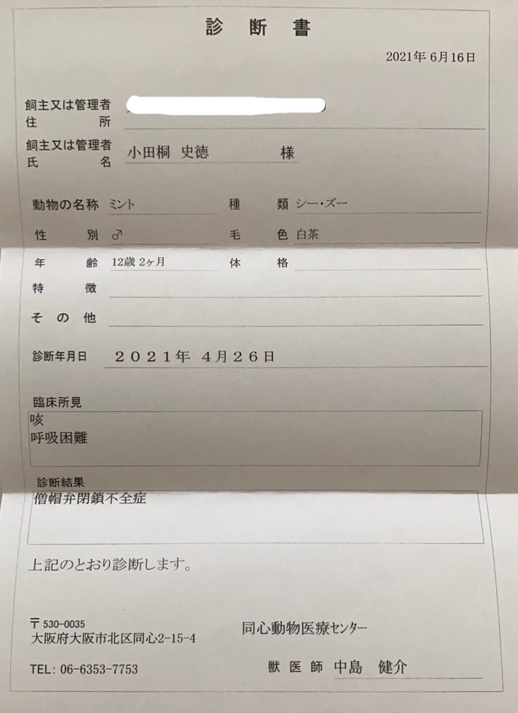 ↑しろきた病院では診断書は書いてもらっていなかったので、その後転院した同心動物医療センターでの診断書となります。