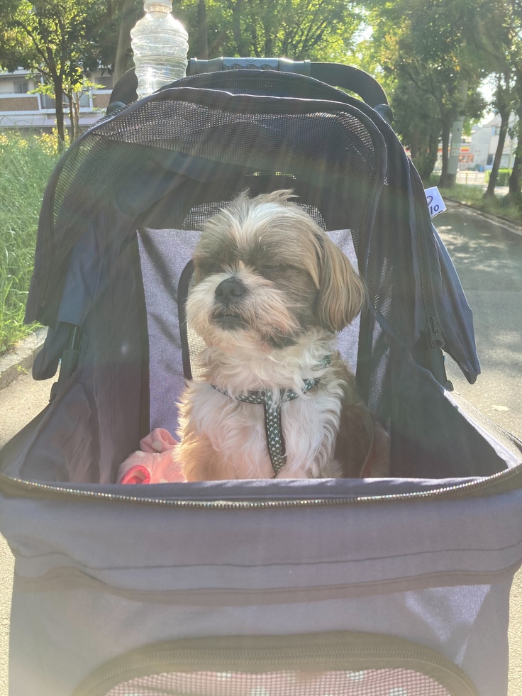 ↑安静のためお散歩ができないのでカートで外の空気を吸っています