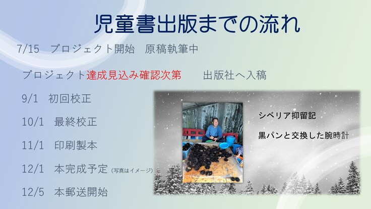 初挑戦のクラウドファンディングお陰様で目標無事に達成出来ました。大変ありがとうございます。シベリア抑留の子ども向けの本はとても少ないです。当初予定よりも増刷予定です。9/3まで引き続きご支援をお願い致します。