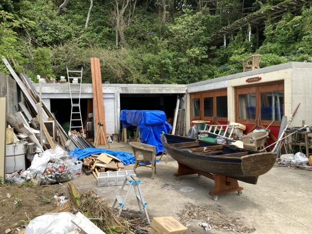 ここはテラス中央の広場です。右手の扉の中が本プロジェクトのミュージアムになります。(展示スペース)連日の猛暑により熱中症に注意しながら、少しずつですが片付けています。暑さがしのげる様になったら、応援のボランティアさん達と一気に整理〜工事を開始する予定です。