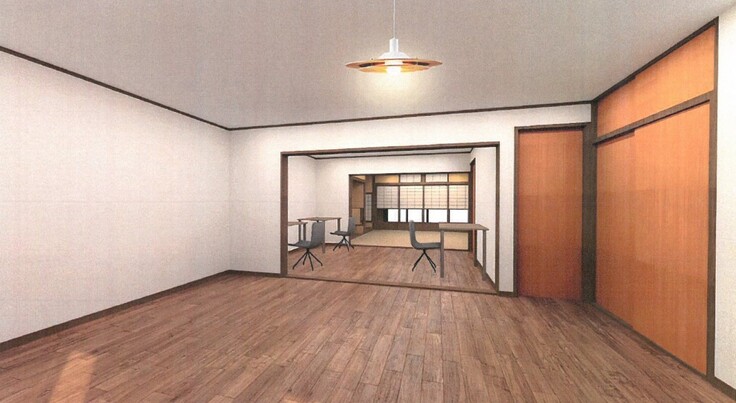 表の洋室と裏の和室の間の洋室は、新大宮広間を管理運営する事務所とします。映像編集室としても活用します。1,2階全体を使ったイベントの際には開放します。