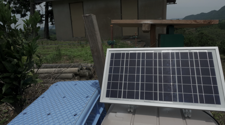 (↑ソーラー式の電気柵。みかん畑の周囲、約1000mを囲っています)