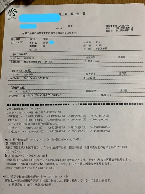 猫伝染性腹膜炎(FIP)だと診断されました。