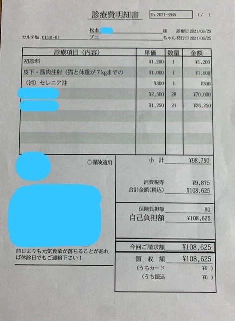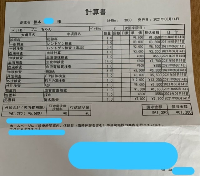 必死に呼吸しながら生きようと頑張っているプニの為に、私達家族に出来る事はしてあげたい!これからも一緒に暮らしたい!と強く願い、プニと同じようにFIPと闘っている猫ちゃん達もその治療法で日々症状が良くなっている事を知り、未知ではありますが、少しでも希望があるのならと思い2021年6月25日紹介して頂いた協力病院へ5時間かけて見てもらいに行きました。