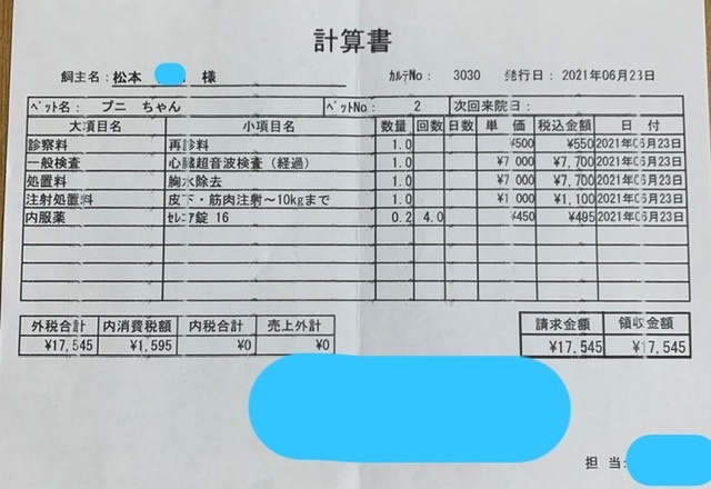 プニの胸水を抜かれる姿を目の前で見ているのはとても辛く、痛くて泣いているプニの声を聞く度涙が止まりませんでした。
