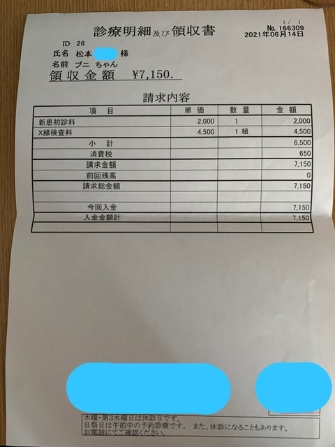 最初に熱を測ってもらった所40.3℃と高熱で、呼吸数が異常に速く感じていた事もありレントゲンもとって頂きました。