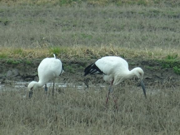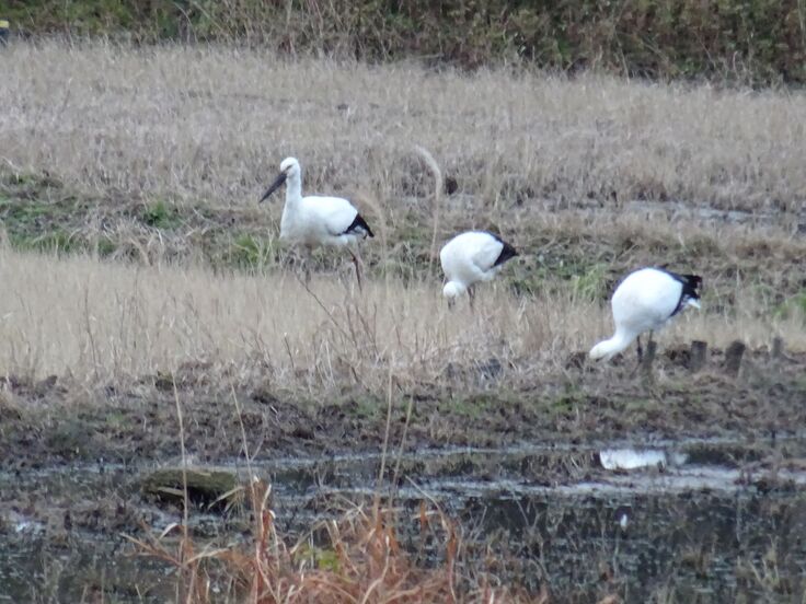 また、コウノトリが年間通して定住するためには秋~冬のエサの確保が必須です。コウノトリは動物性食で大食漢。小さな水生動物や昆虫に食を支えられています。一日に500gのカエルやドジョウが必要で、育ち盛りのヒナは成鳥の2倍ともいわれます。寒く雪が多い北陸地方の冬は水生動物の活動が鈍く、コウノトリにとって過ごしにくい場所とも言えます。