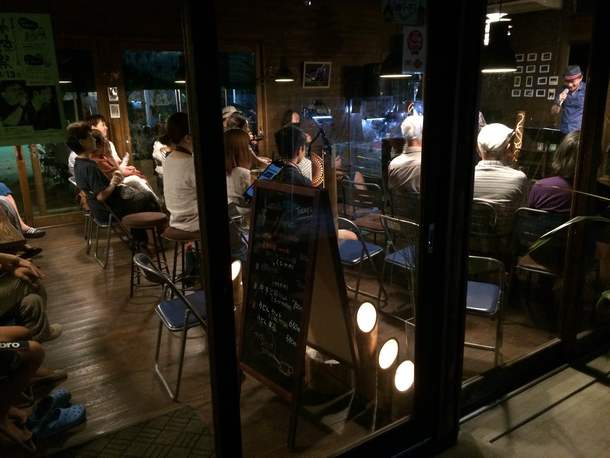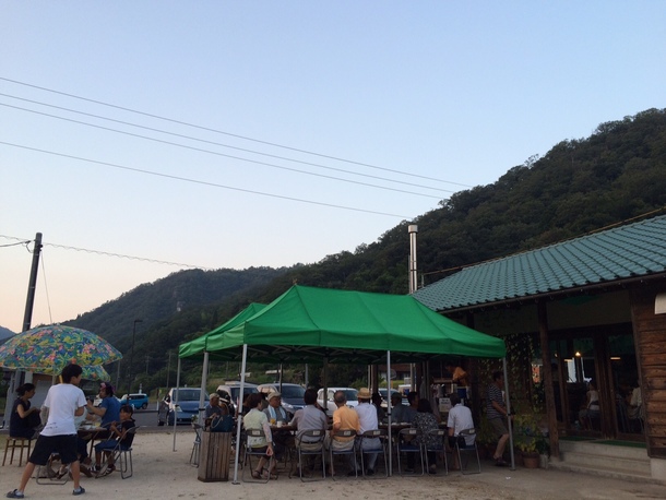 まずはビアガーデン会場でお酒とおつまみにを舌鼓をうちました。なんとビールなどを地元の方に奢っていただきました。恐れ入ります。飲みながらいろいろなお話を聞かせていただきました。そして夜は一夜限りのライブハウス!?みなさんで2時間手拍子をして大和の夜が更けていきました。
