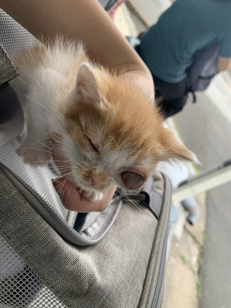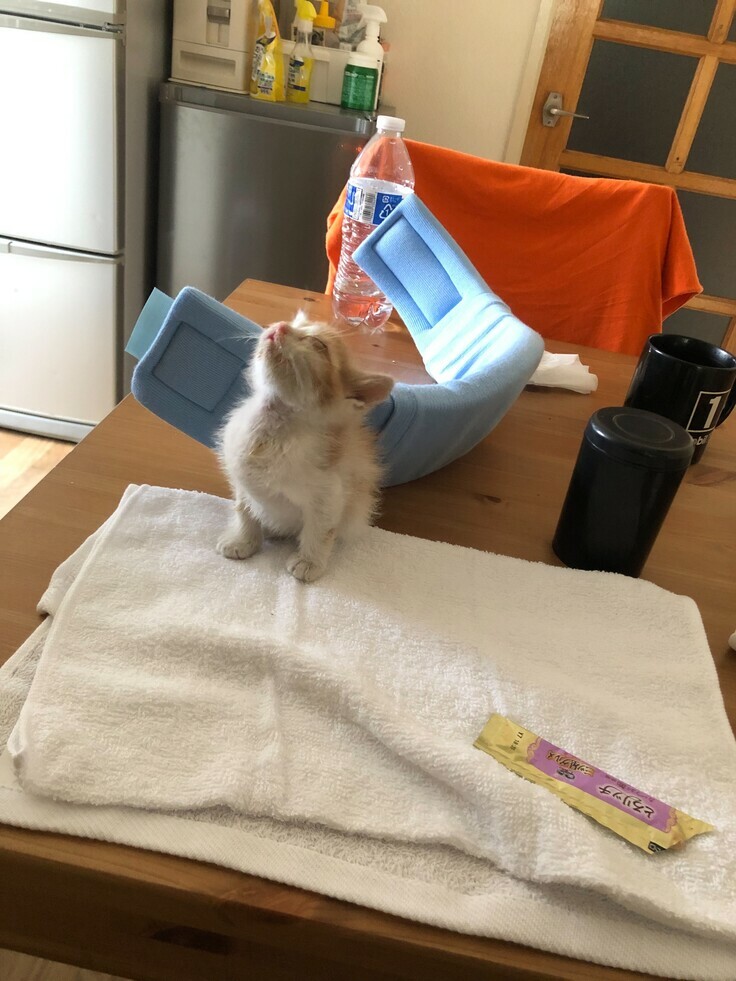 我が家に来た日は約2週間程しか経っておりませんでした。通常であれば自然と開く目も目やにが多い子猫だと開かない場合があり、ぷぅもそうでした。自宅から近くの病院で1週間おきに通院しておりましたが、いつも点眼薬と様子見といわれておりました。また、お腹のふくらみについては何も言われなかった為、太ってきているだけだと思っておりました。しかし、左目が悪化してしまい急いで病院へ行きましましたが既に手遅れのようでした。眼科専門医のいる病院を進められましたが、どこも予約がいっぱいですぐに見てもらえるところはなく今までと変わらず点眼薬と様子見。私は諦める事が出来ずひたすら調べ、やっと見つけたのが現在も通院している病院です。