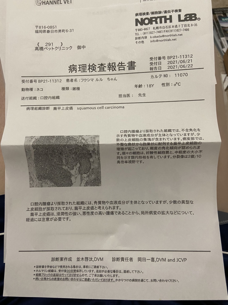 扁平上皮癌は根治が難しい病気だが、緩和ケアをしつつ様子を見ていくことに。