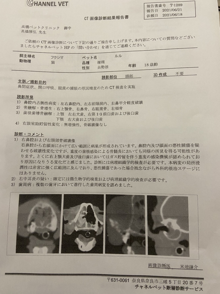 その2日後、最寄りの動物病院ではなく大きな動物病院で細胞診とCT検査をしてもらい、