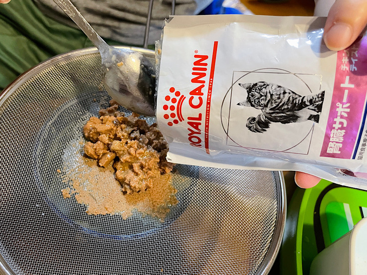 食欲が無い日には、少しでも食欲を出すためにその餌にプラスしてエネルギーちゅーるで香り付けをしたり、コルディというサプリメントを水の代わりに入れたり、手術後に療法食として出されるような香りの強い餌を表面に乗せたりしています。