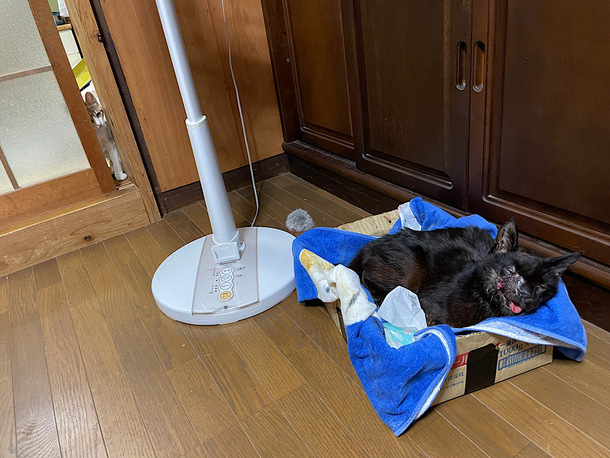 子猫ちゃんが隙間からチラッと見ていて、ルルちゃんは気づいていないです🐈⬛🐈
