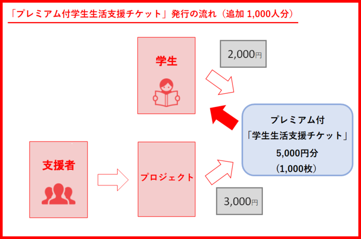 このプロジェクトは 5,000円分の「プレミアム付学生生活支援チケット」を学生は 2,000円で購入することができ、差額分はプロジェクトから負担するという仕組みです。