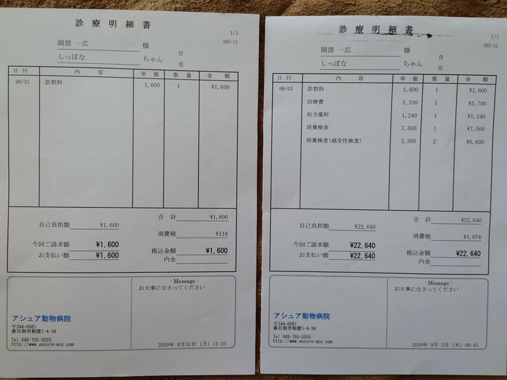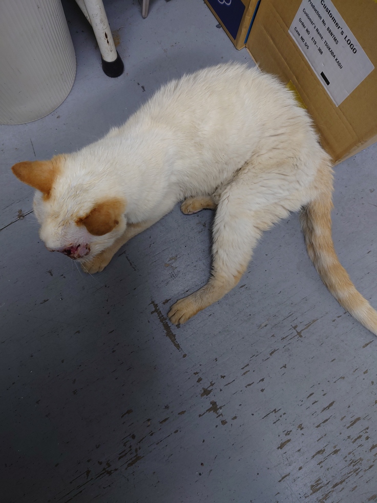 かなり痩せていたので、注射をうってもらい少し体力が回復したら腫れている左目とおでこの部分の検査をすると言われ、右目も白内障で見えてないとのことでした。
