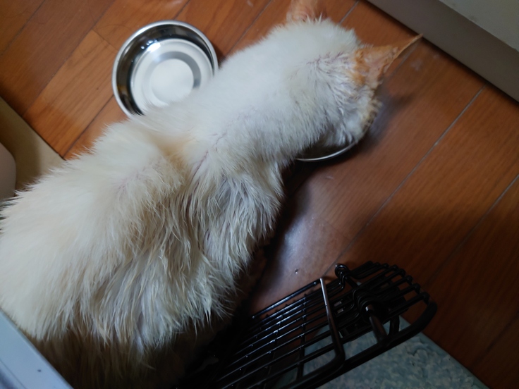注射のおかげ少し回復したのか、落ち着いたようだったので汚れてる体を洗ってあげました。スッキリしたのか少しずつご飯を食べてくれるようになりました。