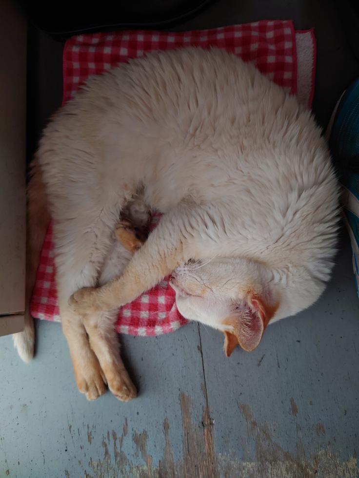 真夏の暑い日にジュニアスクールの準備でコートに入ったところ、端に白い猫がよこになってました。