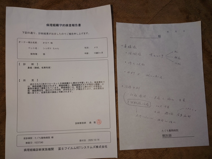すぐにCTやMRIなどが行われ、鼻の癌だとわかりました。猫に多い病気とのことでしたが、うちの猫たちは、なったことがないのでビックリしました。