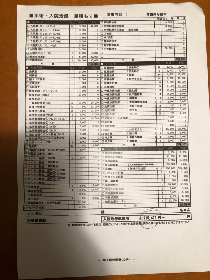 手術費用の見積です。