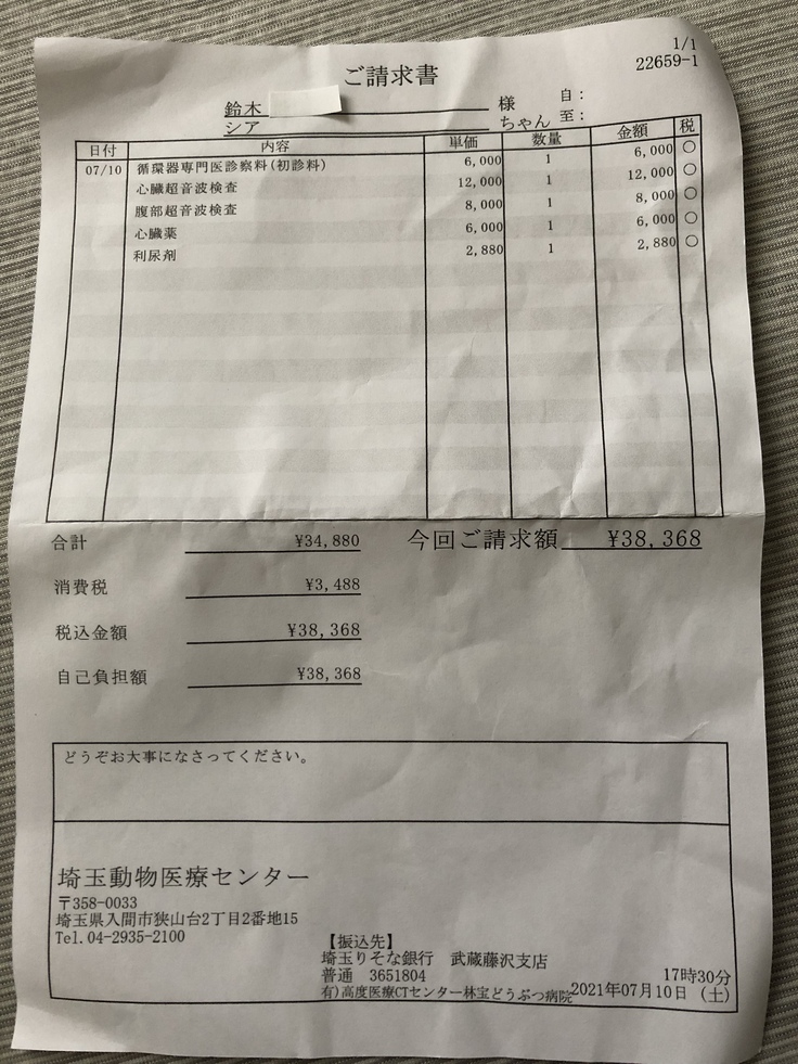 食欲も落ちていたこともあり、かかりつけの病院にて精密検査を受けました。