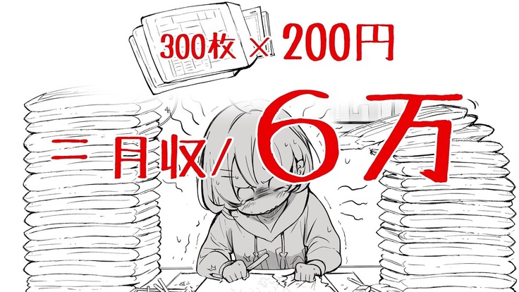TVシリーズの場合、動画の枚数単価は1枚200円程度。1ヶ月に300枚描いて、300枚×200円で月収6万円。