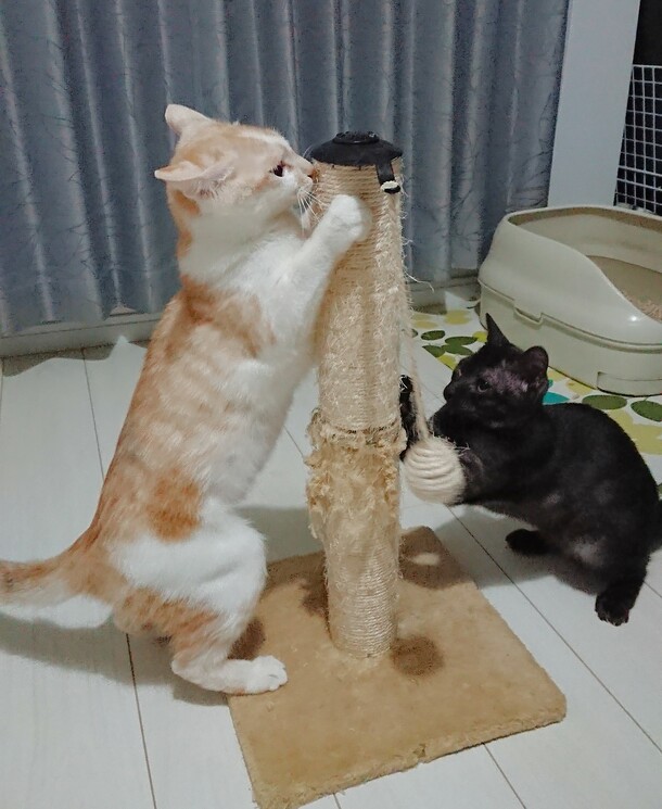 写真はくろべぇに爪とぎの手解きを行っているにゃん吉です。