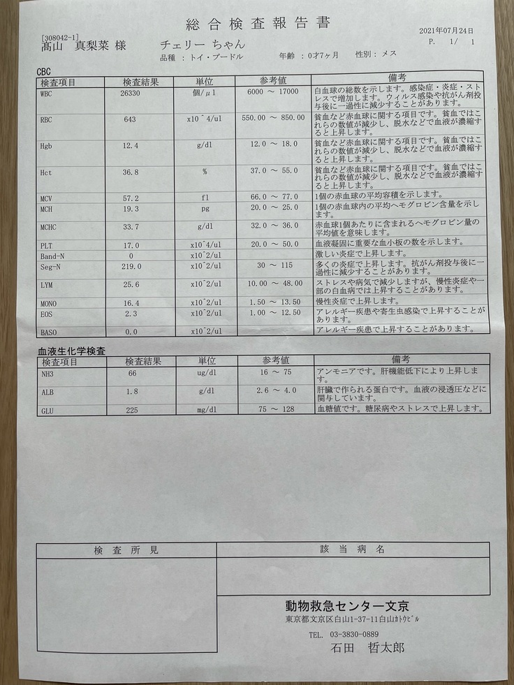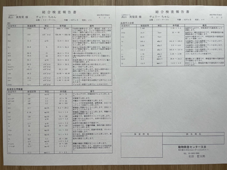 何度呼びかけても床に頭を擦りつけて鳴き叫ぶばかり、直ぐにかかりつけ医に連絡をして状況を伝えると、こちらでは(一次診療)詳しく診ることはできないのでと、詳しい検査が出来る二次診療の病院を紹介されて、車で片道50分以上もの距離でしたが病院までの道中も苦しみながら鳴くチェリーに『大丈夫だから頑張って』と祈る思いで運びました。
