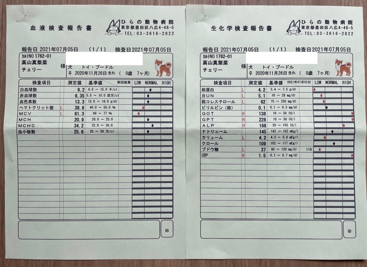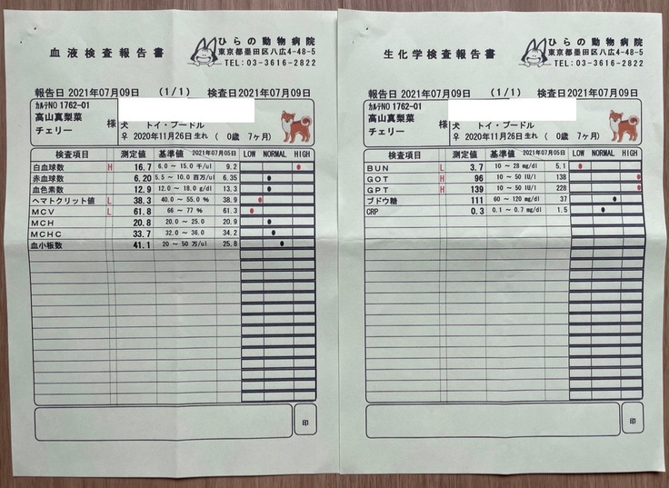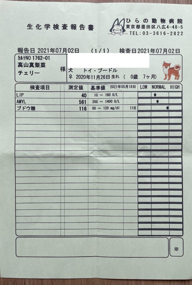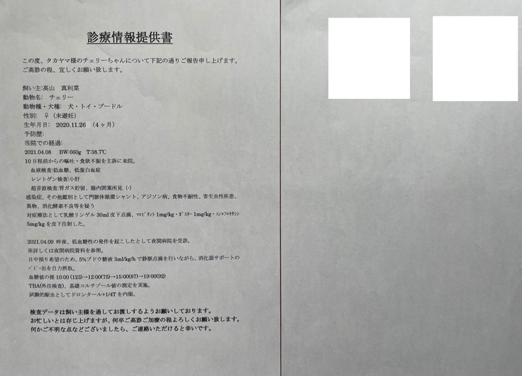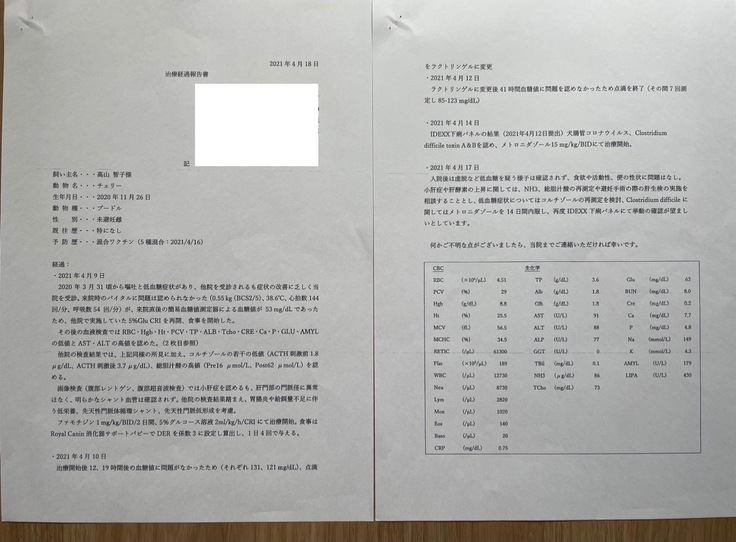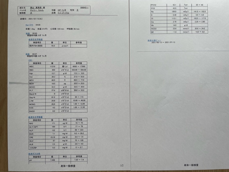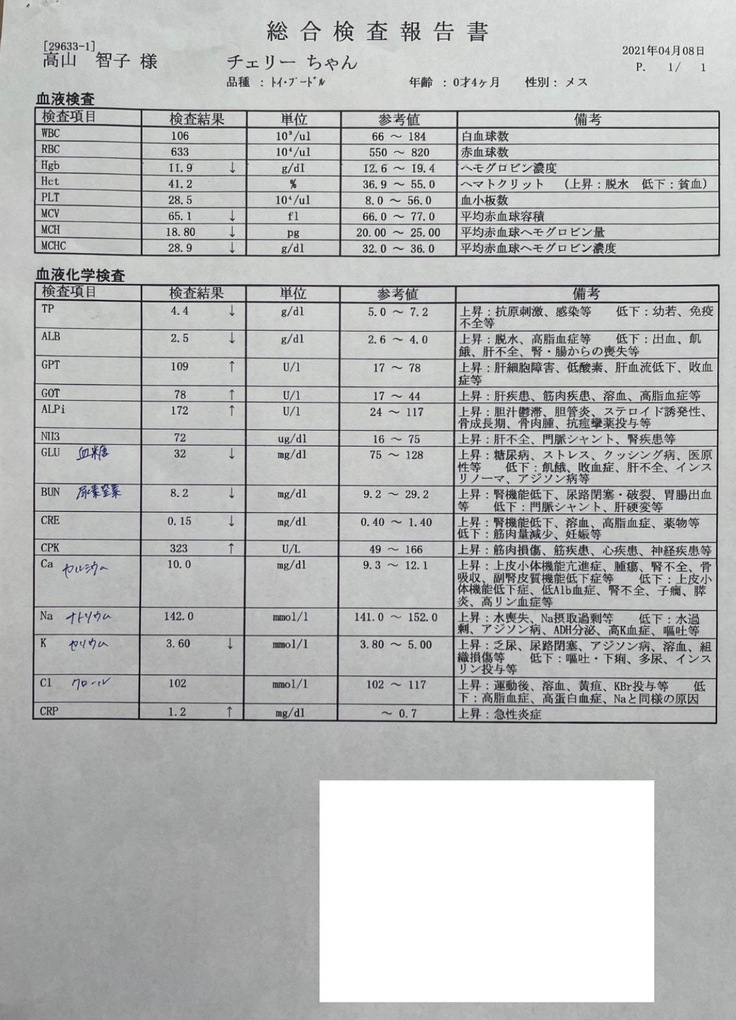 チェリーが生後4か月を迎えた頃、消化不良による嘔吐を繰り返すようになり、低血糖で意識が無くなり昏睡状態に陥るなど危ない状態になり慌てて夜間救急に運び一時的に回復しても帰宅後直ぐにぐったりとまた急変し、一日に三軒の動物病院をはしごする日もありました。なかなか体調が戻らず不安定で食事も消化に優しい食事療法で少し安定したかと思ってもまた数日もしない内に嘔吐を繰り返し、病院を受診しては検査ばかりの日々が続きました。チェリー本人はもちろん私たち家族もとても不安な毎日でした。