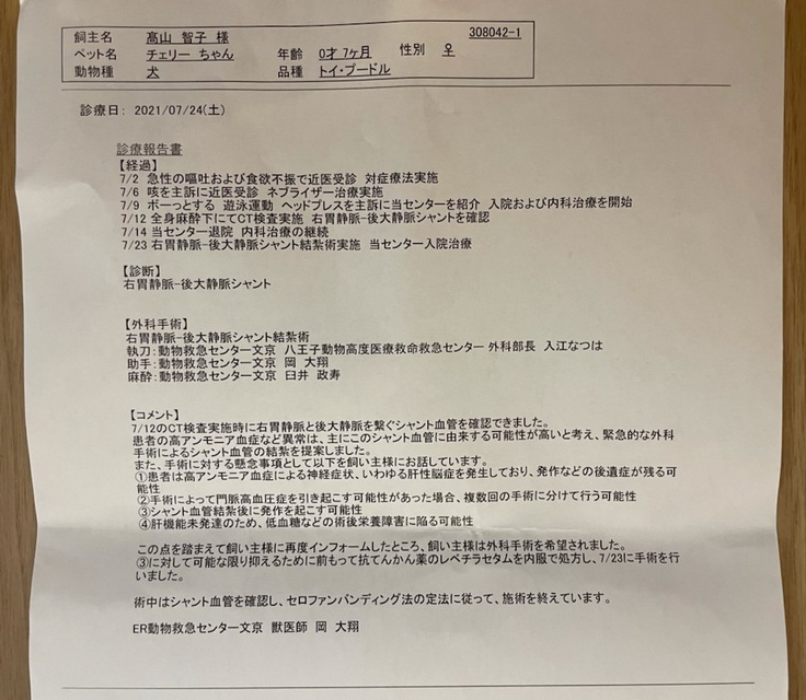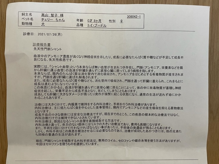 高アンモニア血症の異常は、主にこのシャント血管に由来すると考えられるため、外科手術によるシャント血管を結紮する手術をすれば根治する見込みがあると手術を勧められる。