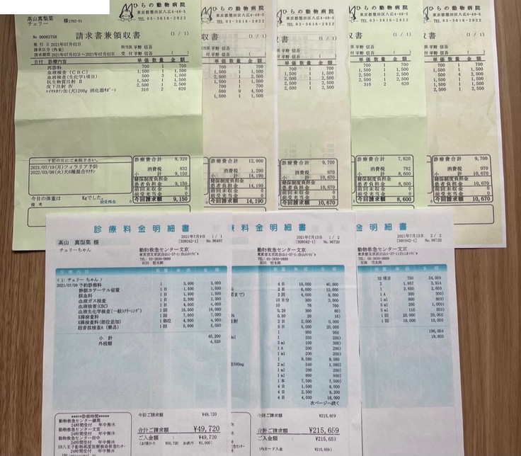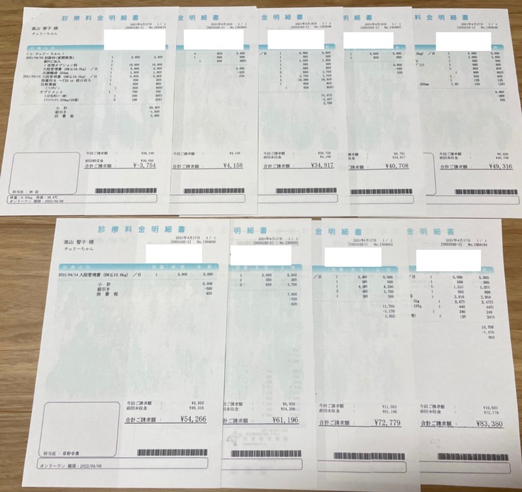 これまで幾つもの病院で治療して頂きました。これまでの入院や度重なる検査に治療で、FPCペット保険の入院と通院の適応限度枠の回数もこの4か月程でほぼ使い切ってしまいました。