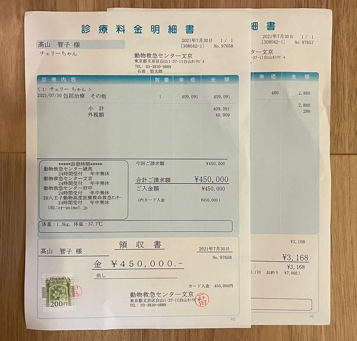 ですので、術後にかかった検査や通院費も含めて、総額で約200万円近くの医療費がかかりました。私達家族もチェリーを助ける為に、どうにか治療を進めていきたいと、消費者金融機関で無理な借り入れをしてでも退院時に支払わなければならず、動物病院には迷惑が掛けられないため費用の工面にはとても悩みました。