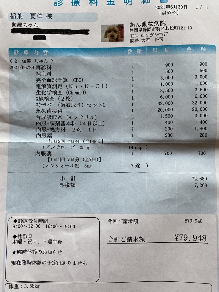 主人と、もしかして、食べないんじゃなくて痛くて食べられないのでは?と話し、6月29日すぐに治療をしてもらいました