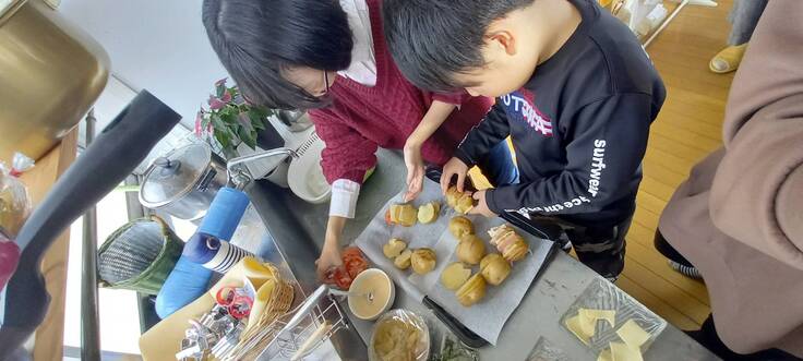 (キッチン 畑でとれたジャガイモをオーブンに入れて焼きました!めちゃめちゃ美味しい!)
