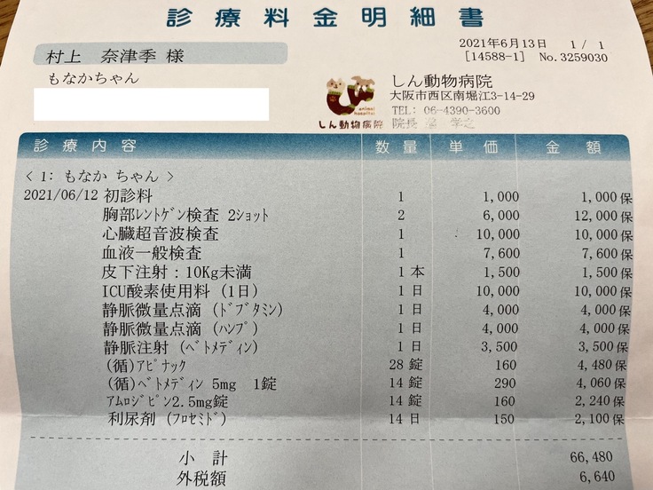 毎回のレントゲンやエコー、血液検査や薬代と金額は大きくなる一方で、病気が発覚してから1ヶ月間での病院代は10万円でした。