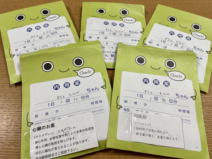 ・6月13日〜:肺水腫になってからは呼吸の状態が安定しない日々が今も続いており、現在1〜2週間毎に通院しています。呼吸が荒くなる度先生に相談し、薬の種類や量を調整していますが…現在は毎日5種類×2回もの薬を服用しています。(現在は6種類/1日4回に増えました)