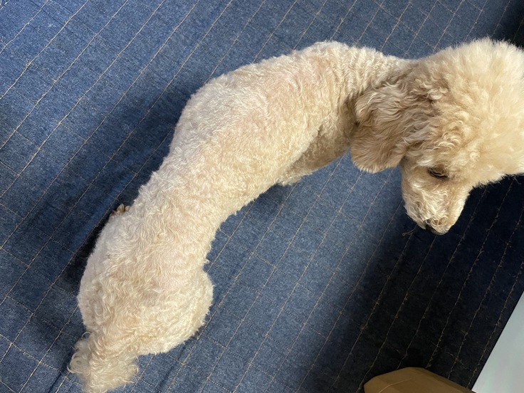 また、これまでは元気いっぱいだったもなかですが最近は日中もほとんど横になって過ごしています。横になるも、一日中咳込みが続くためゆっくり寝ることはできずに辛そうにしています。特に夜中は体勢を変える度に咳込み、苦しくて立ち上がり、なかなか熟睡出来ない状況です。飼い主の私も、いつ発作が起こるのかわからない不安との戦いで、夜通しもなかの呼吸を確認し…咳をする度に上体を起こして背中をさすり…精神的にも疲弊しています。また、利尿剤服用の副作用で一日に何度も何度もトイレに行させる必要がありますが、病気で身体が疲れやすくなり散歩を嫌がる日も増えました。以前は外に出ることが本当に大好きで、散歩を楽しみに生きていたような子が…元気だったときのことを思い出すだけで目に涙が溜まります。
