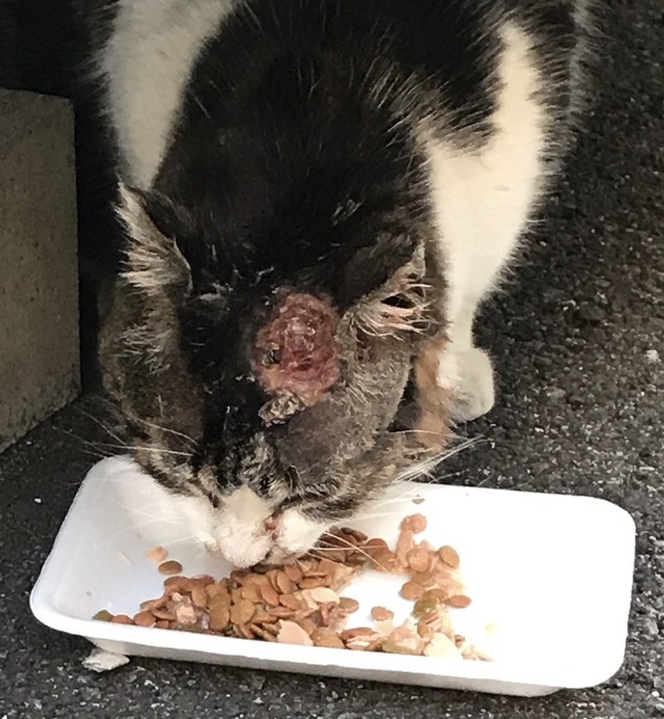 上述のとおり、横浜のとある地域でたくましく生きていた野良猫です。傷の状態から、またご近所の噂から虐待の可能性も疑われています。犬歯の2本は折れ、歯肉炎も酷いですが、食欲はあります。怒りのうなり声をあげながらちゅーるを食べる様は悲しいやら、笑ってしまうやら…。無傷で地域の方々に快く受け入れられているなら良いのですが、そうでも無かったこともあり、Aさんは捕獲に踏み切ったようです。