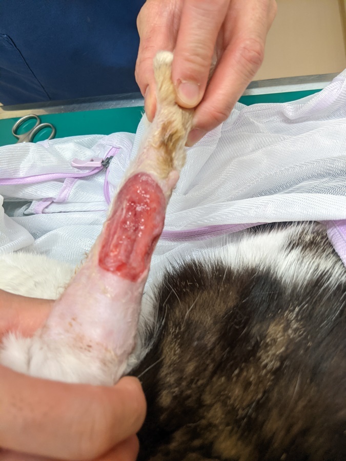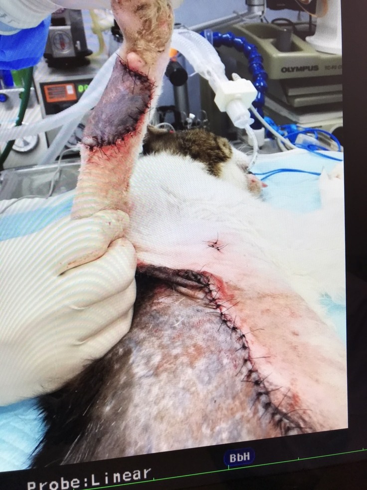 前足に腹部皮膚が定着した後、壊死の可能性もあり、最悪再手術と入院延長。