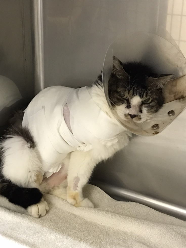 経済的にも猫の居場所としても贅沢なことは何もできませんが、隔離が必要な場合に使用する部屋が空いていましたので、右前肢の治療が終わるまで、最長1年お預かりするということとしました。餌やトイレのような消耗品は私持ち、医療費はそのAさん持ち、ということで二人三脚で彼を助ける活動をとなったのですが、ここで大きなハードルがお金でした。頭部の怪我の治療費が約5万円、右前肢に至ってはいくらかかるか分からない難易度高の手術が必要で、病院は3件ほど回りましたが、どの先生も、白旗を上げてしまわれました。そんな中で1件だけ都内の創傷治療に強みを持つ病院で手術をして頂けることとなりました。