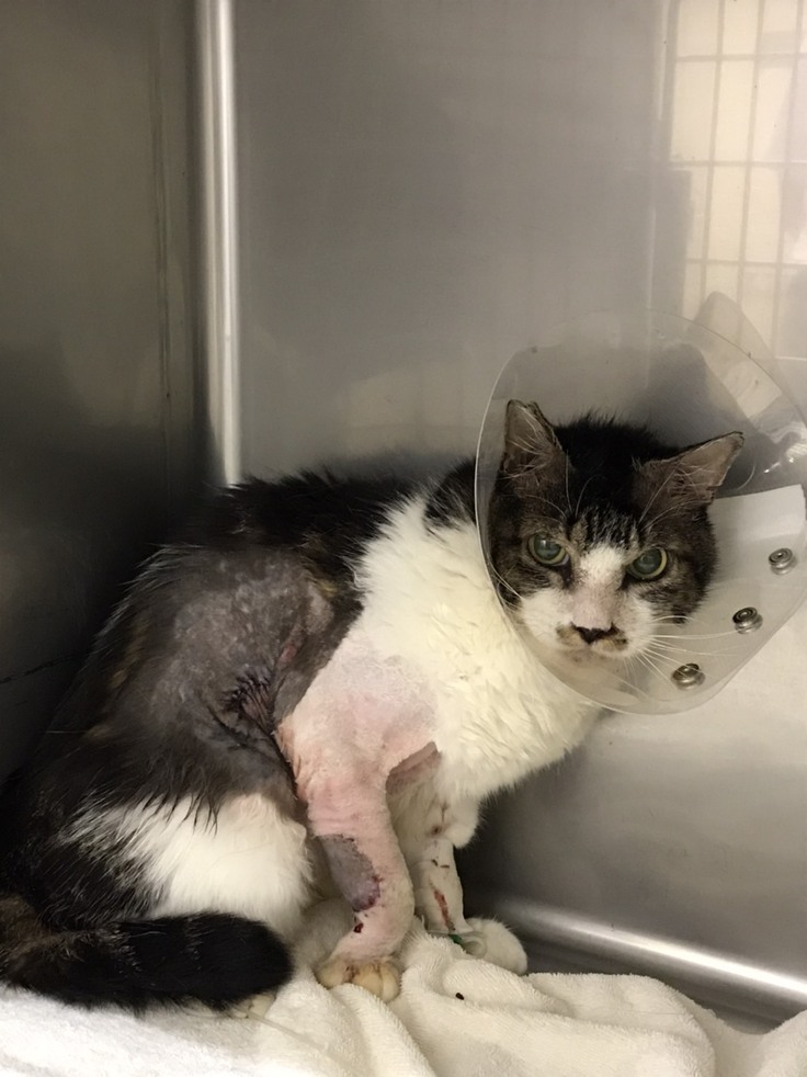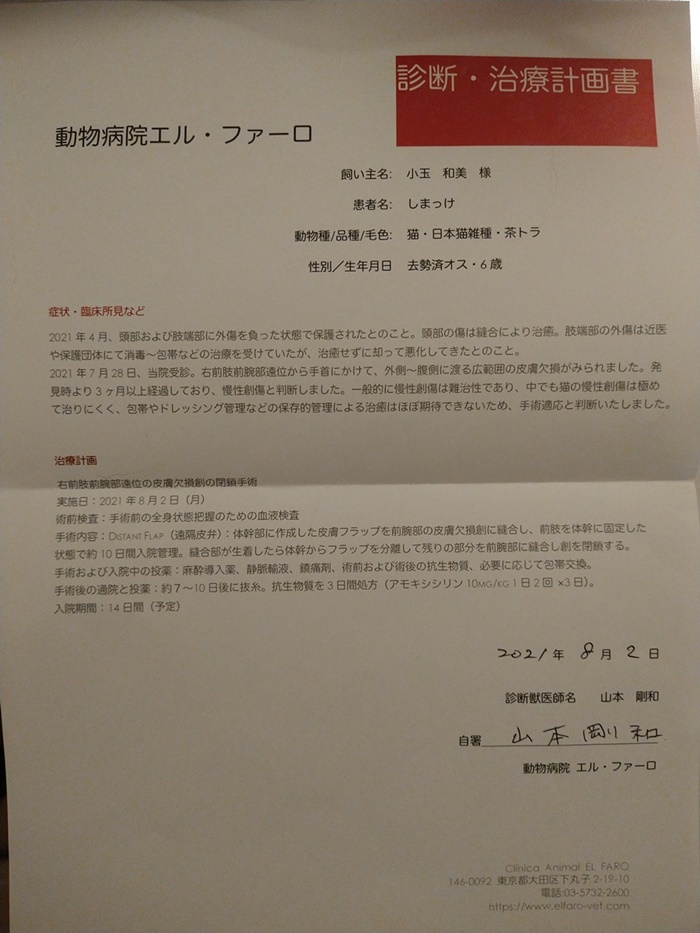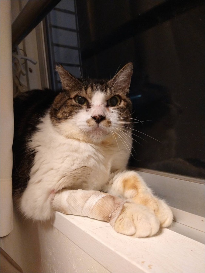 貴富プロジェクツの小玉と申します。2008年に目黒円融寺で死にかけた猫を保護したことをきっかけに猫のボランティアを細々としております。現在、複数頭の貰い手が現れなかった猫達と暮らしつつ、近所の地域猫活動についてもささやかながらサポートを続けております。実際は今以上の保護猫がおりましたが、残念なことに2021年に入って2頭が様々な病気により虹の橋のたもとで見送らなければならなくなり、かつ、数年前から腎臓病を患っている猫数匹、喘息を患っている猫1匹に治療費がかかり、5月には肝臓嚢胞を切除する手術をした猫に60万円以上の費用が掛かりました。ここにさらにしまっけが加わることになりました。しまっけは、雄猫、推定6歳、エイズ陽性、去勢済、白サバ模様の雑種で、横浜のある地域で野良猫として暮らしていたようです。(私の地域の地域猫ではありません)ある時、ある人Aさんが彼の負った額と右前肢の傷を見て、治療のために捕獲し、額の傷の治療は何とか終わりましたが、右前肢の治療法が中々見つからず、ご本人の事情により、ご自宅に彼を引き取ることもできずにいたところ、たまたま私とご縁がありました。