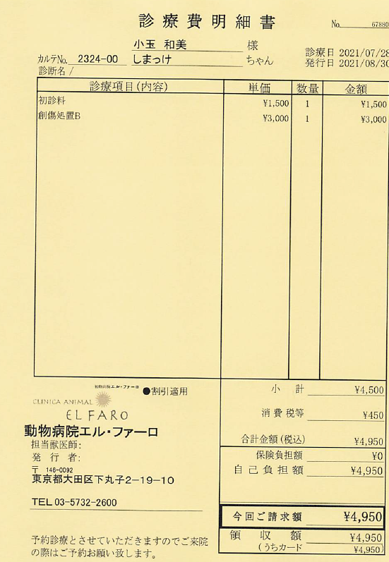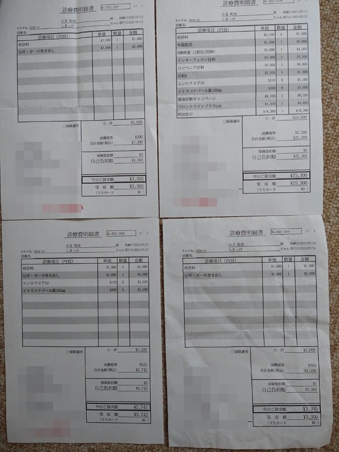 既に頭部裂傷の治療は完了し、支払い済、右前肢広範囲の皮ふ剥離の治療も既に支払い済、中止はありません。(既に貯金を切り崩したり、親類縁者に借り入れるなどで、お金はどんどん出て行っている状態です)