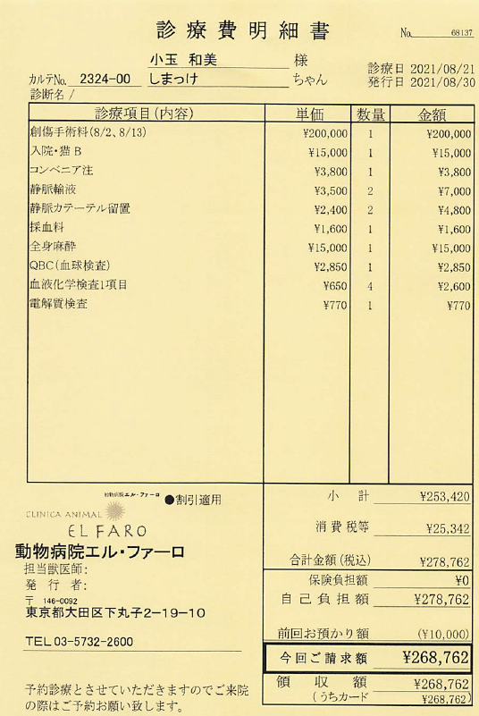 例えば、今、しまっけが死んでしまっても手術は完了しておりますので、手術の支払いすでに発生しており、そのため返金は致しかねます。