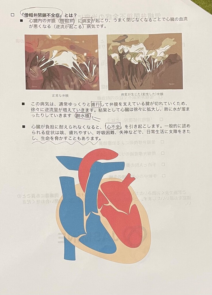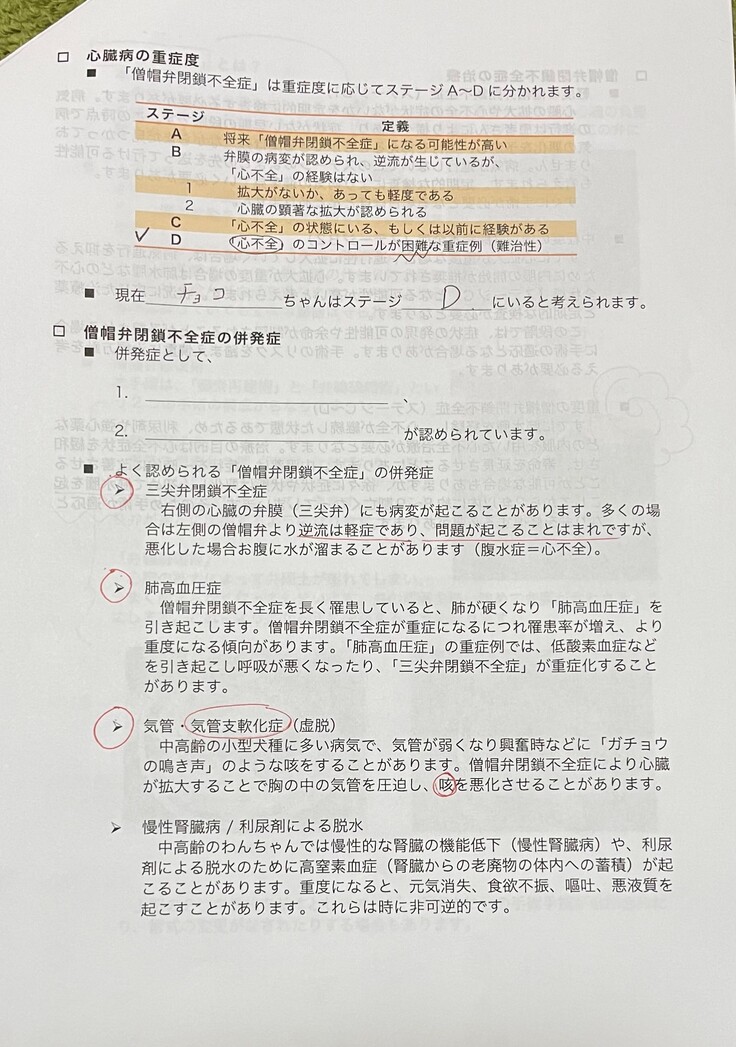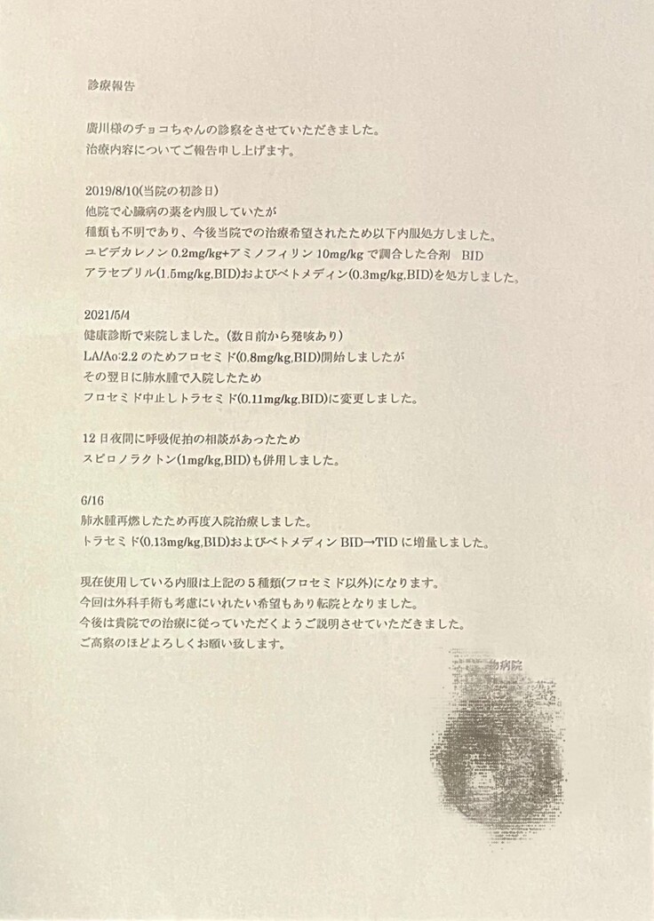 現在、僧帽弁閉鎖不全症ステージDと診断されています。他にも軽度腎臓結石があります。