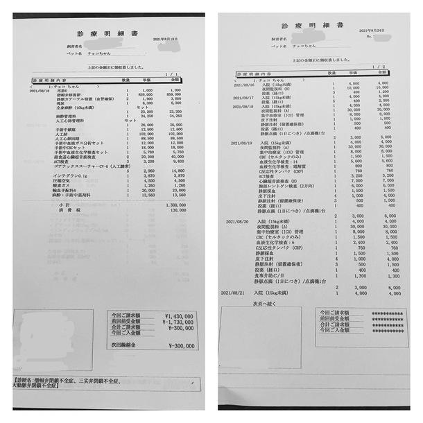 大変遅くなりましたが、今回かかった手術・入院費用の明細書をご報告致します。尚、こちらには手術前検査費用は含まれていません。