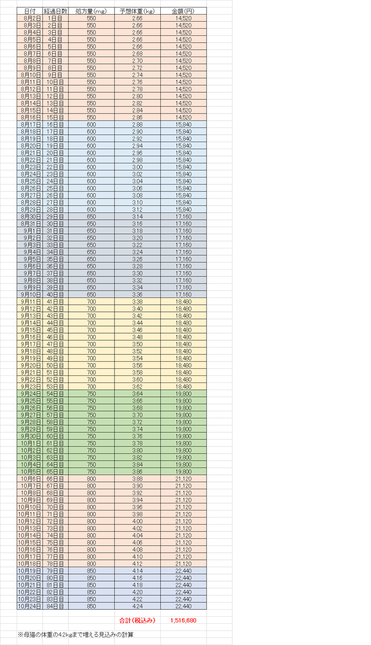 ■84日間の体重予測からの処方量と金額のシュミレーション