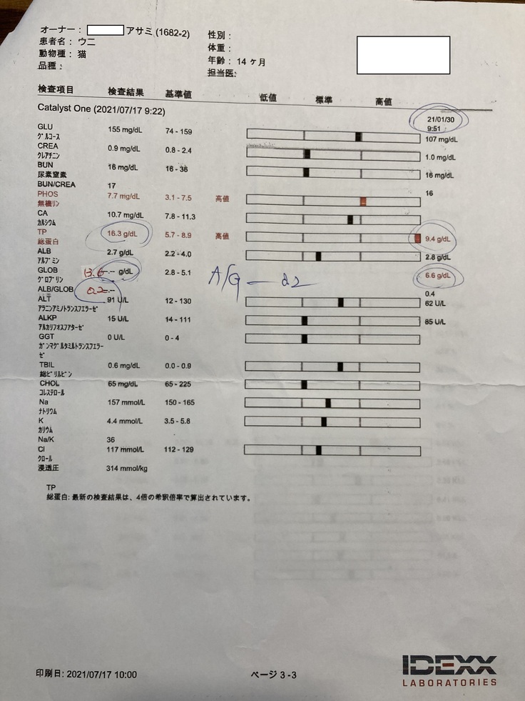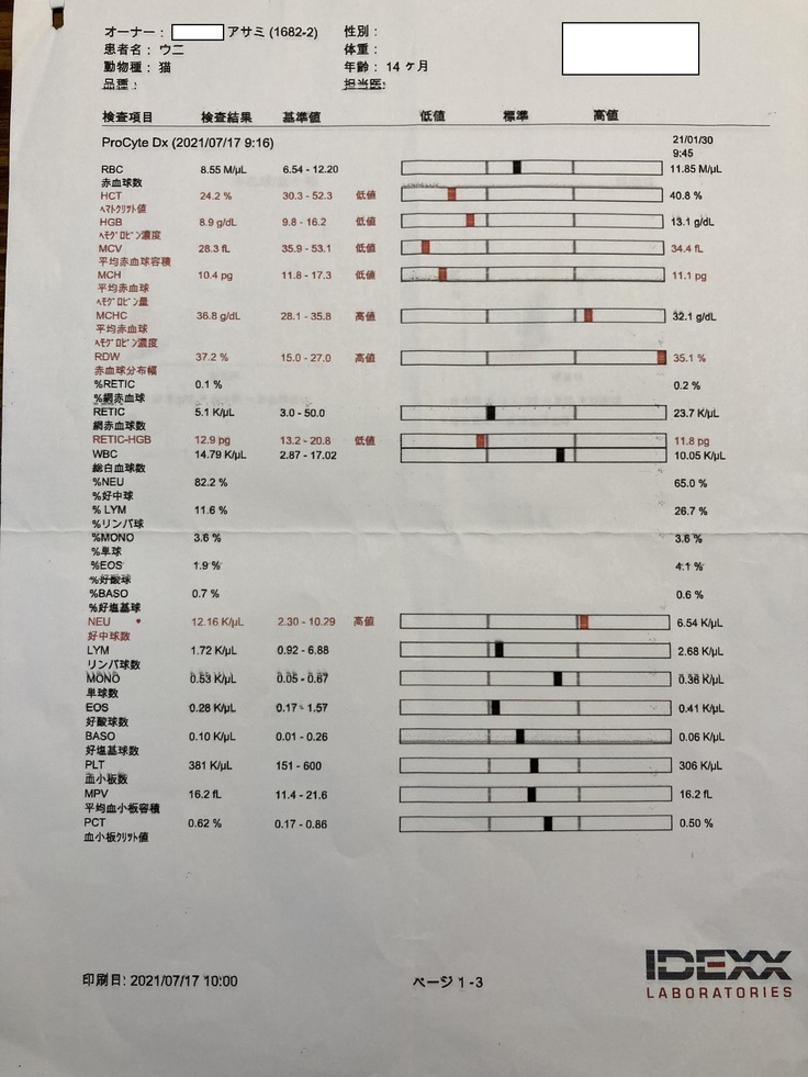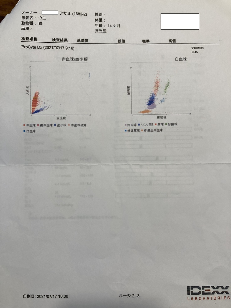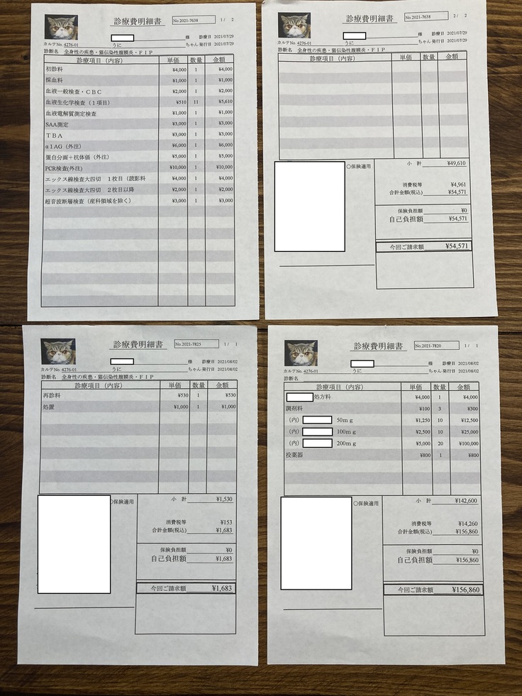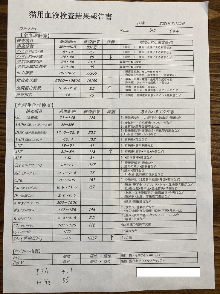 しかし、やはり炎症とたんぱくの数値が高く、貧血と肝臓の数値も悪いという検査結果が出てしまいました。PCR検査は外部での検査となるため後日結果がわかるとのことでしたが、こちらの病院でもほぼFIPを発症していることに間違いないとの診断でした。