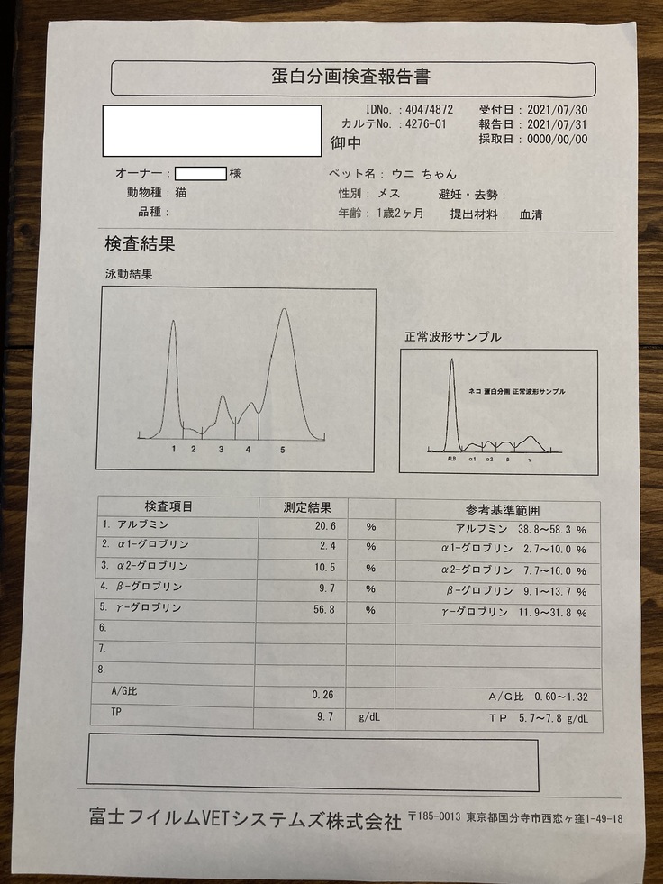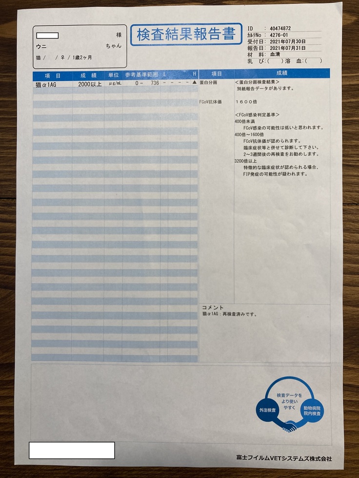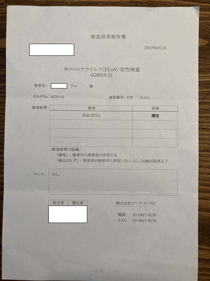 血液検査をした結果は、炎症とたんぱくの数値がかなり高く、その他の異常な数値を総合的にみてFIPである可能性が高いとの診断を受けました。