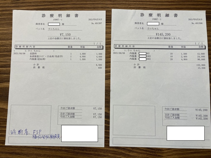 うにの命を助けるため、FIPに効果がある未承認薬の投薬を84日間持続させます。
