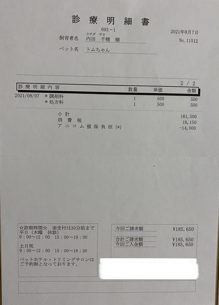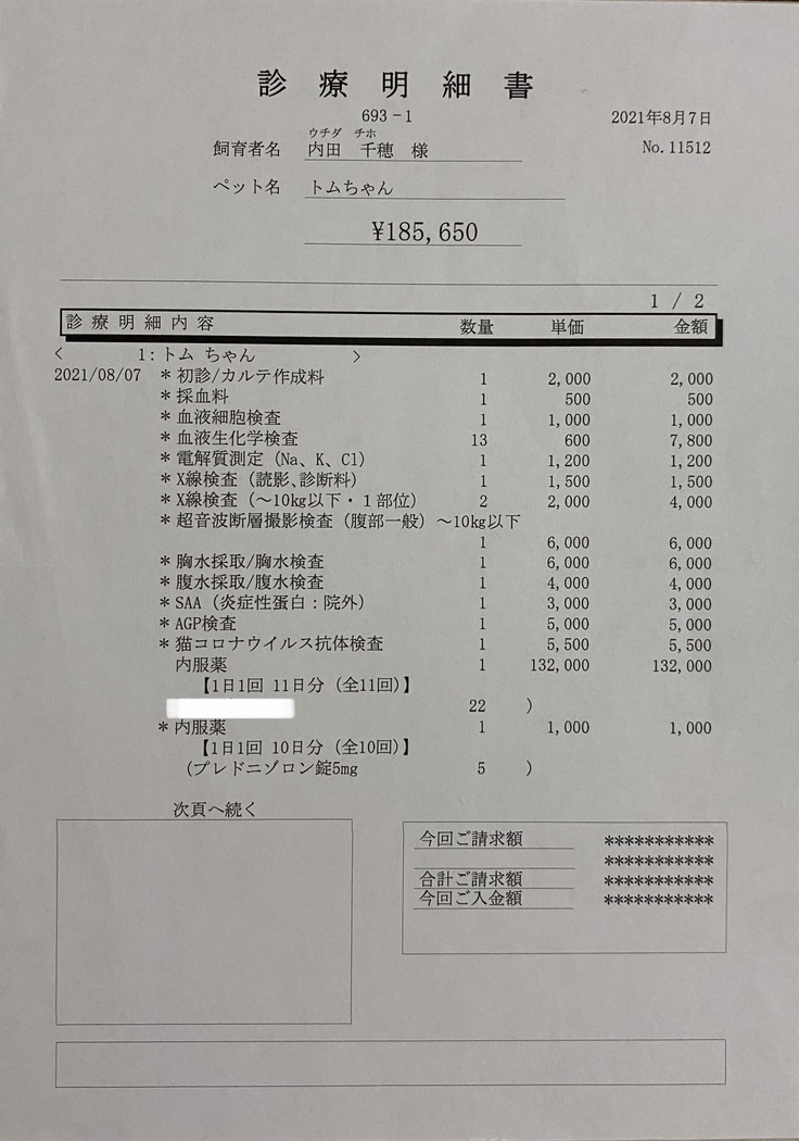 万が一、治療の最中にトムが亡くなってしまった場合につきましても、それまでに掛かった治療費に充てさせて頂きますので、ご理解の程よろしくお願い致します。