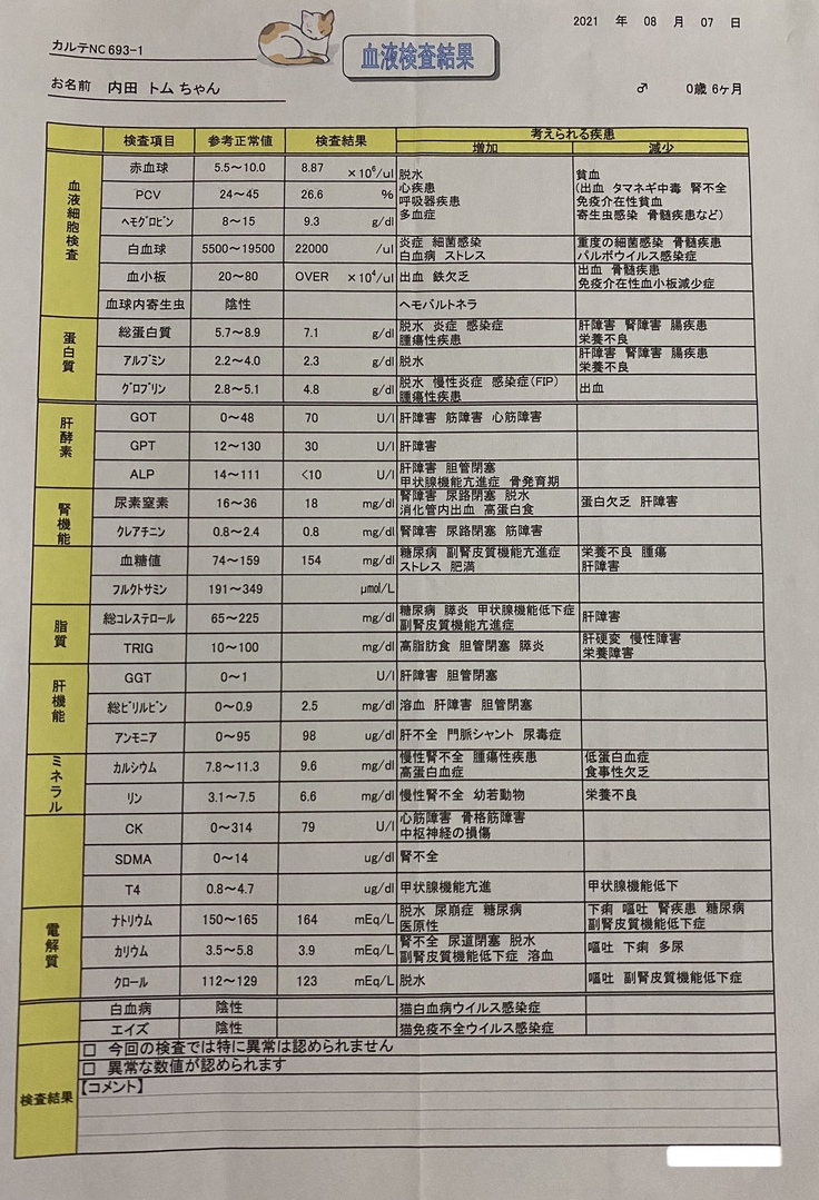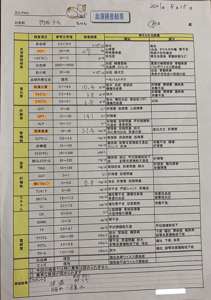 病気を見つけてくれた病院で受けた猫コロナウイルスの検査結果が出て、FIP陽性ということが確定しました。